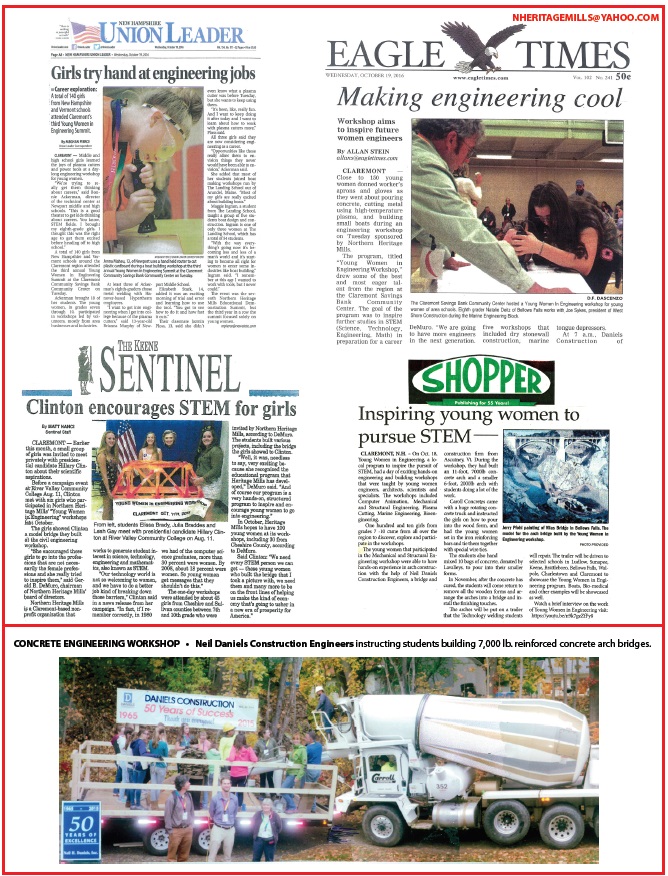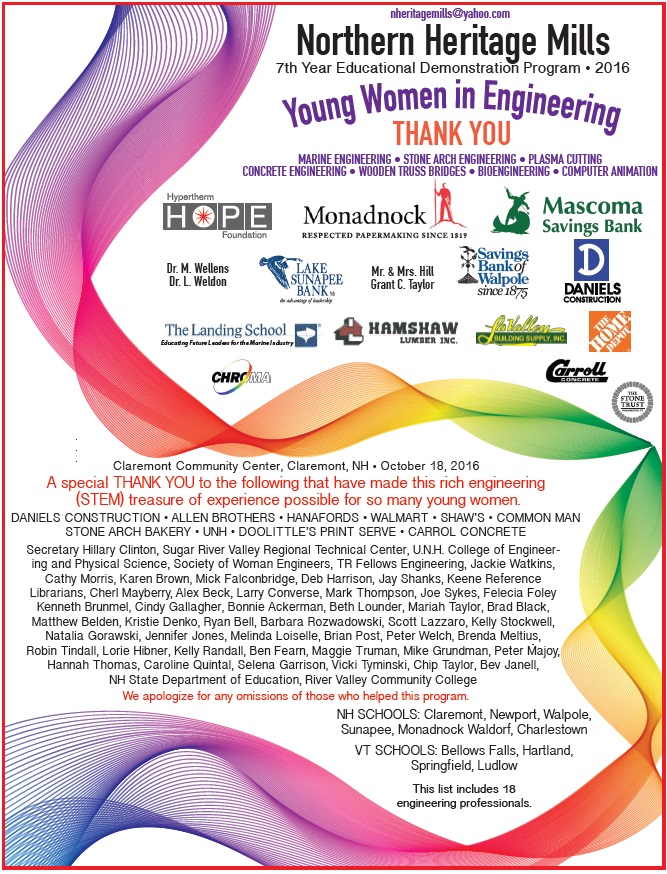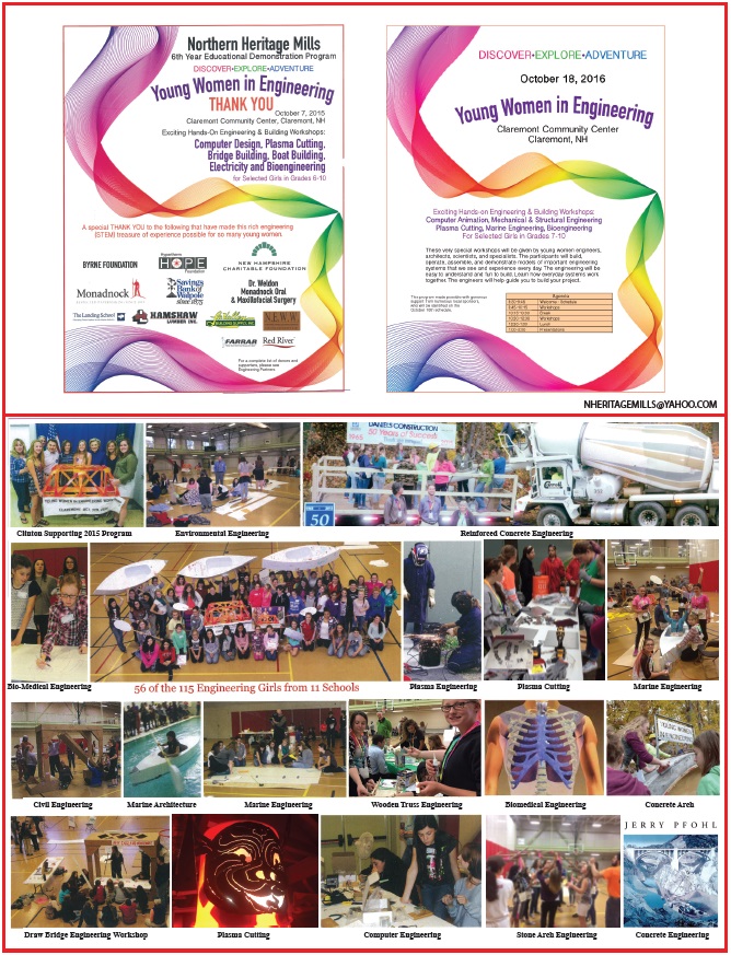 Engineering the controls for the hyrdo-electric boat.(left) The educational hydro-electric demonstration boat's waterwheel in action.(right) Northern Heritage Mills will also demonstrate other historical working technologies. Regional Program for Young Women Professional women will encourage young women of promise to enter historically non-traditional industries: engineering, science, manufacturing, technology and leadership, in the northern New England region.